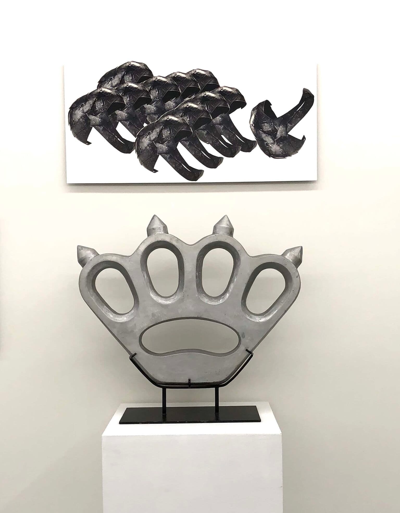 Top: Stacey Dolen. Troop (2017). Digital print on aluminum. 17.5″ x 36″. Bottom: Phillipe Perrin. Monumental Brass Knuckles (2000). Cast aluminum. 23″ x 29.5″ x 3.5″.