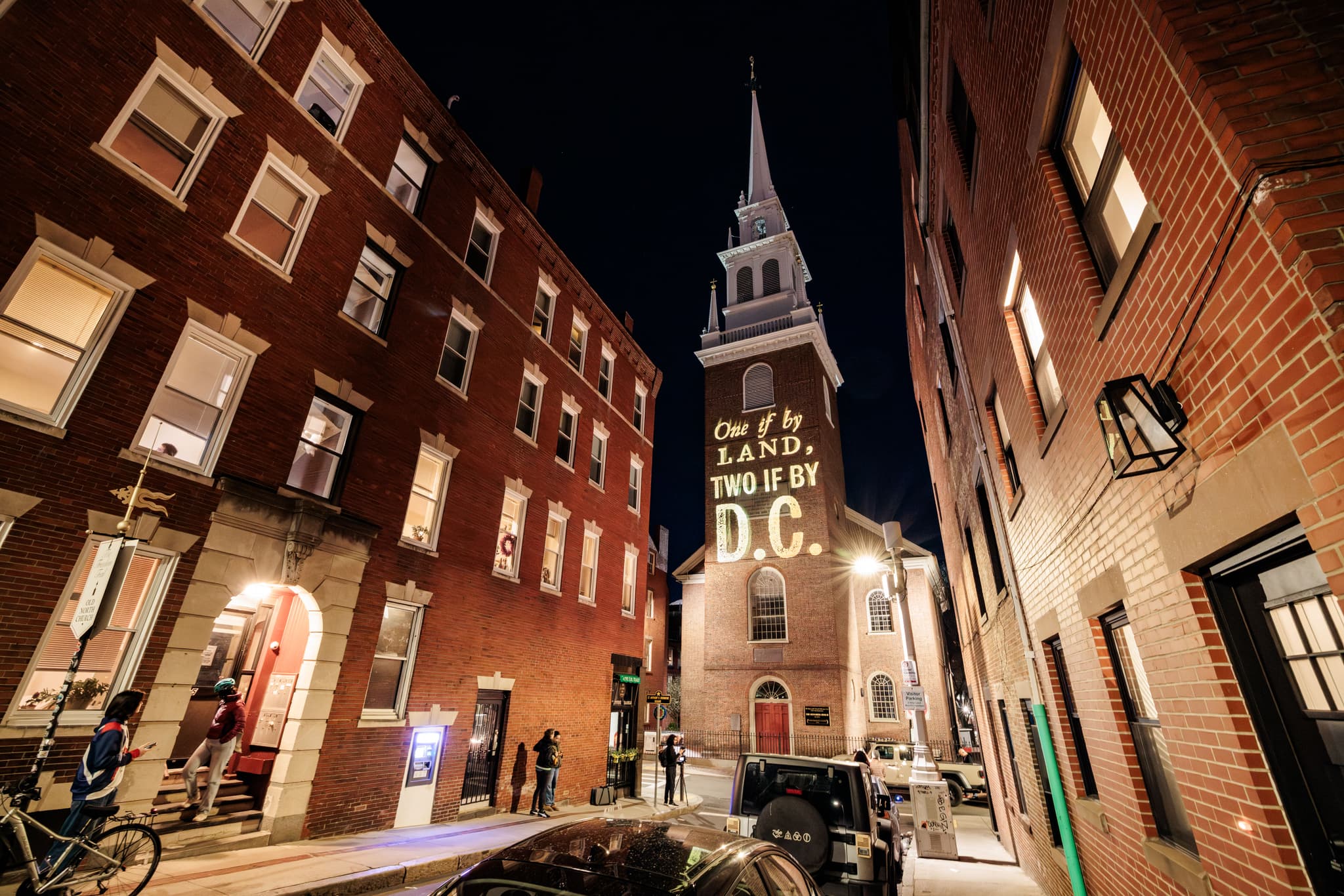 Silence Dogood’s projections on Old North Church, Boston, MA, 2025. Photo by Aram Boghosian.