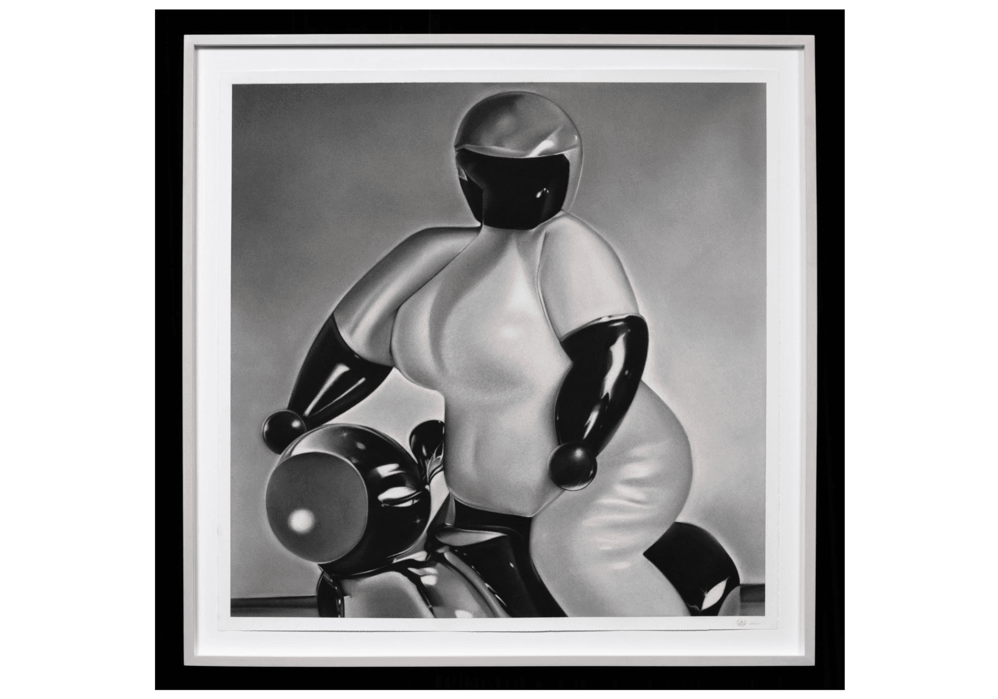 Once they have a plan, they work together on every piece, approaching a page or a canvas like co-quilters. Pisetti explained, “I’ll be watching what Josh is doing and try to make sure what I’m doing feels like what he’s doing, and then he’ll simultaneously be looking at what I’m doing and try to do that. Sometimes I’ll finish something and be like, ‘What you were working on looks so good!’ And he’ll say, ‘Really? I was just trying to copy what you’re doing.’ And then I’ll say, ‘Wait—I was copying what you were doing!’” “Kat and I imagine ourselves in these scenes,” Allen admits. “They will have our eyes or parts of our bodies in them. We are observers and performers. There’s a certain sense of drag, dress-up, and play.” Pisetti added: “We want to create these beautiful creatures and shield them with these beautiful things. It is very emotional. I feel like we can see ourselves in them, because we also want to be protected from the things in life that have harmed us.” At their studio, we also discussed how tight and revealing fetishwear has made its way into everyday life. There’s nowhere to hide. Yet, at “Bimboteque,” for as many machos, showgirls, and offbeat runaway models I observed, still so much suggested protection, what Allen called “highly crafted exterior shells.” I felt like I’d visited a members-only, safe-space sex club. Drawn zipped into a comprehensive catsuit, Bimbot (2023) posed on an opulent fur bed. She wore something like a bowling ball for a glove, and her Missy Elliott goggle sunglasses seemed snapped into her hair-shaped helmet above her face mask. In the painting Worship of the Lady From Behind (2023), the costumes of the entwined figures looked embroidered. They were not just getting busy on elegant furniture, they were merging with it.