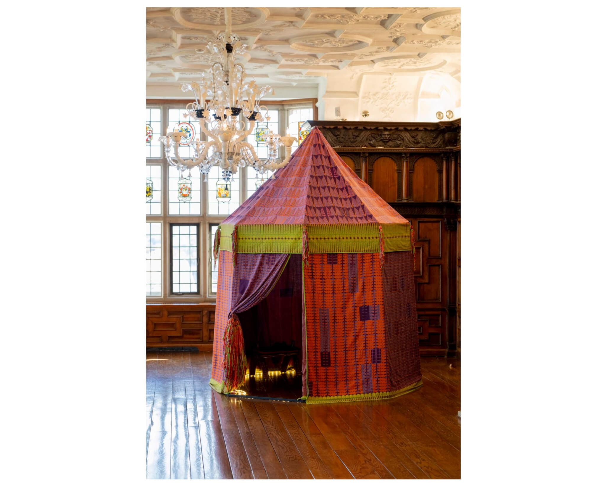 Museums are often quiet, but the installation Mobile Palace (2021–2022) feels particularly hushed. The scale of the structure and the way it filters the gallery’s lights contribute to this reverent atmosphere. Underneath, two simple bed-like benches appear both inviting in their simplicity and sculptural in their restraint. Three pedestals emit soft light upward, illuminating the fabric while also evoking the spiritual aspects of both making and witnessing art.
